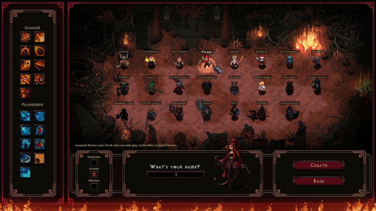 There are a plethora of archetypes to select from in the game and each one is associated with a different set of skills and abilities. Select a character slot and assign the hero you want to play with. On the same screen, you can select the gameplay mode (see bottom left of the image above). Beginners should stick with Seasonal only; Odyssey disables multiplayer and Hardcore ramps up difficulty.