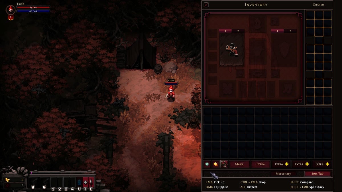 You can open your character inventory by pressing C (default) on clicking on the sword icon on the bar in the bottom left corner of the HUD. There you can check and edit the gear your hero is using, i.e., weapons, gloves, charms, relics, etc. The bottom half displays items such as gems, potions, keys, and everything else in the main tab. You can buy more slots if needed by clicking on Extra.