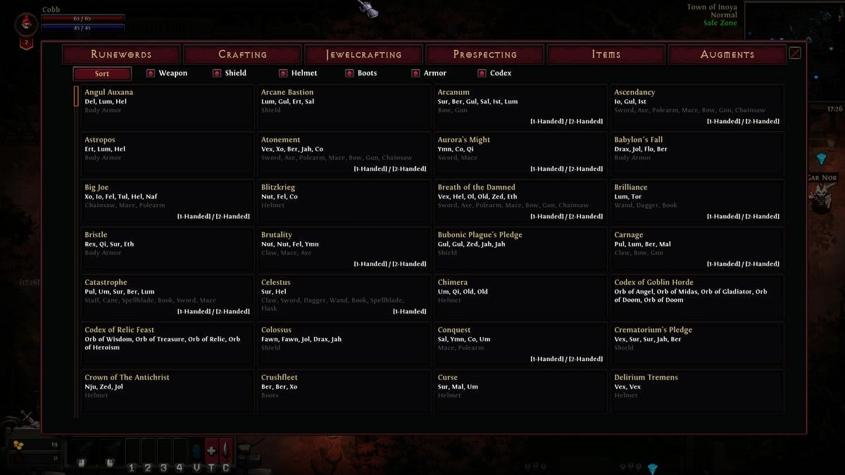 Press Escape and select the book icon to open the in-game Journal where you can see the Runewords, Crafting Recipes, Jewelcrafting, Augments, Items List, and much more.