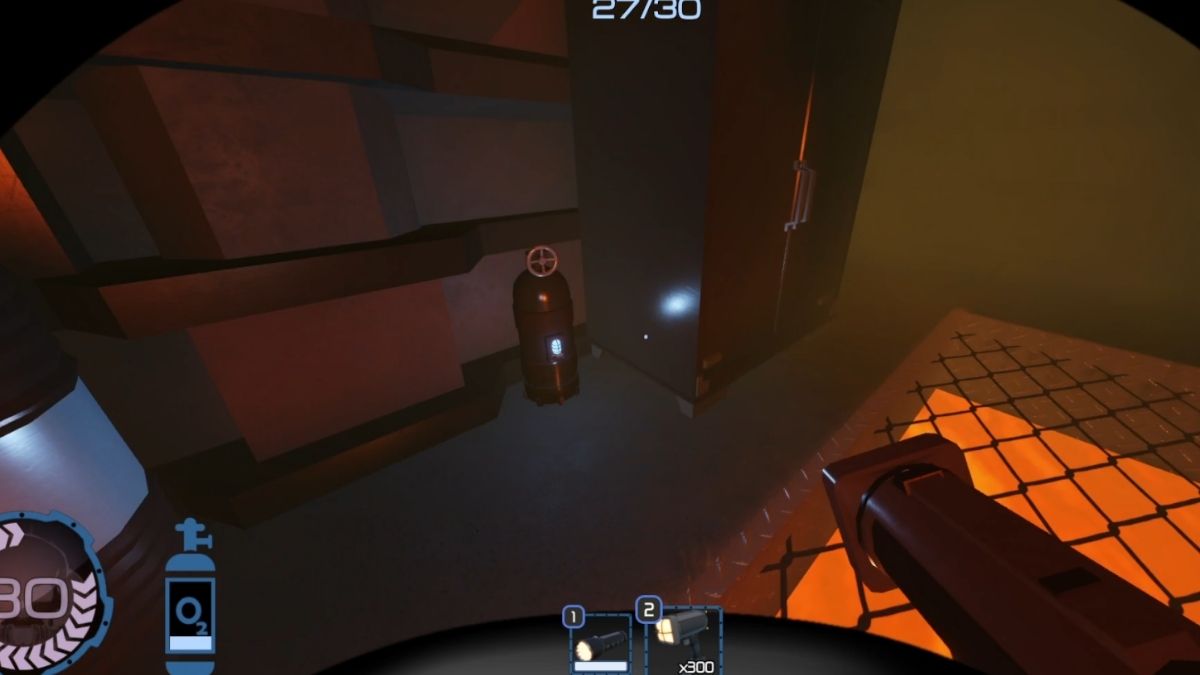 The seconds stage starts at 14 Intensity Increases and this time you'll have to pay attention to your oxygen. There's an icon in your left corner which indicates how much oxygen you have left. You can refill it with oxygen bottles which are beeping when you enter a room. This way as well as by following the blinking blue light, you should be able to easily find them in the darkness.