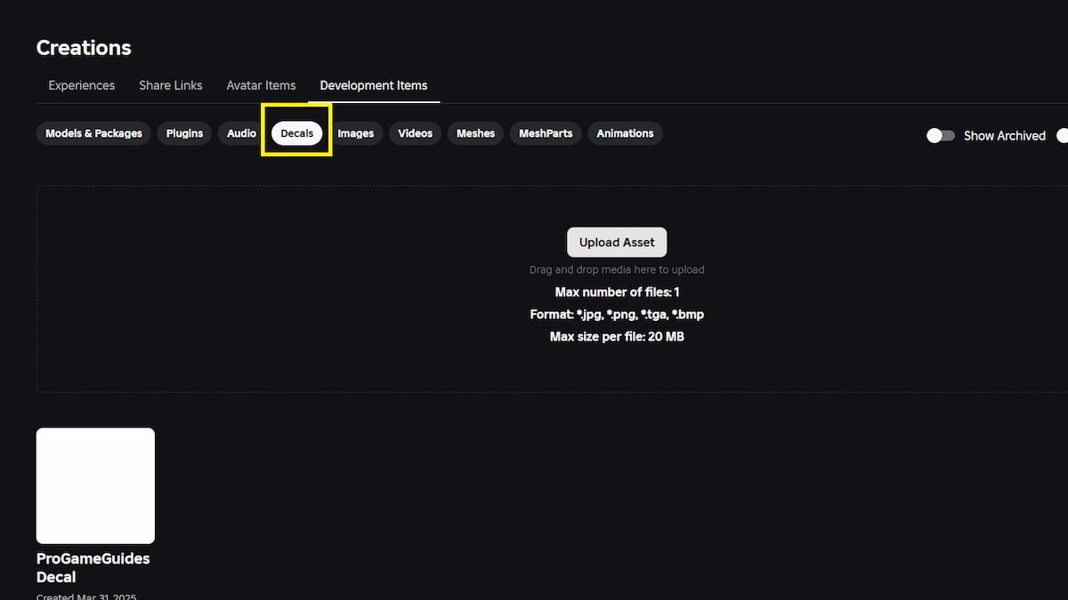 For the Guild Image, you can either upload a custom image at your disposal or use any image on the Roblox forum. Click the given link to open the Roblox Asset Store. Here, under the Development Items, press Decals and upload the image of your Guild.