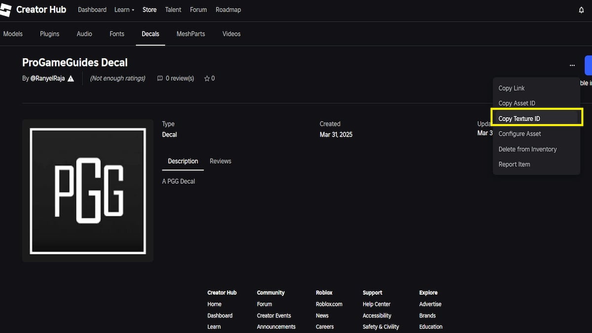 Open the uploaded Decal page and copy the Texture ID as shown in the below picture.