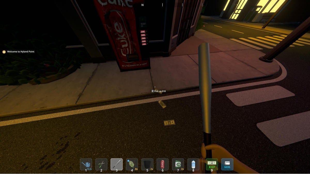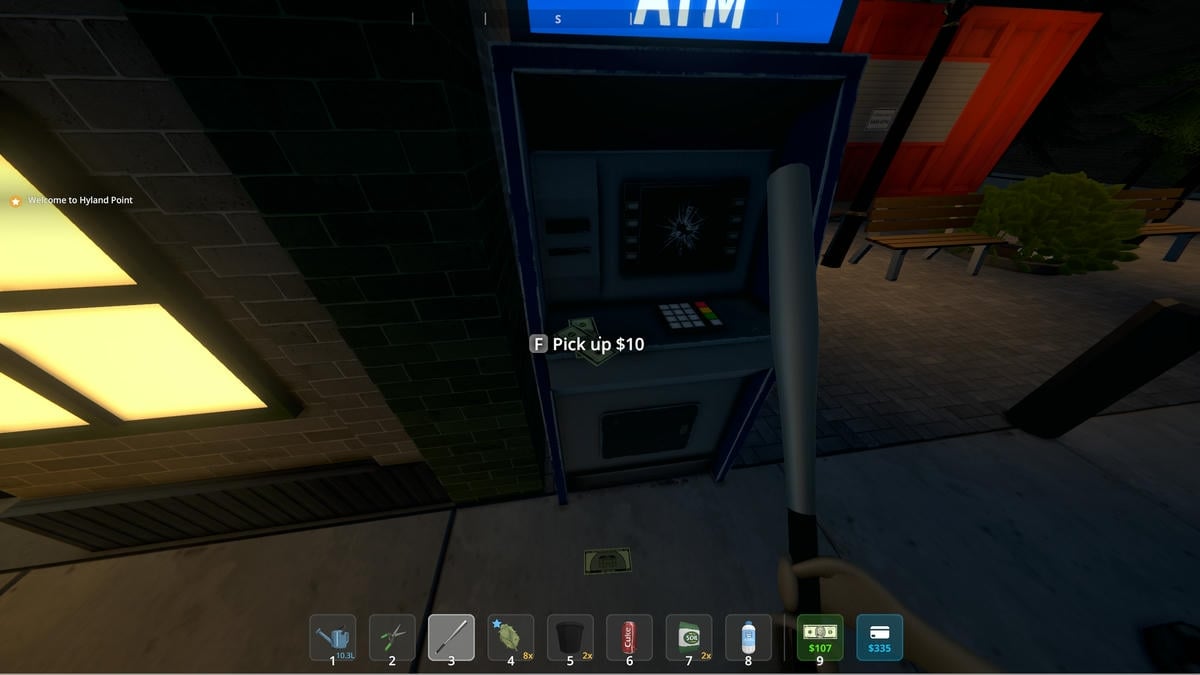 You can arm yourself for free with a Baseball Bat. You can pick it up from the Basketball Court north of the motel you stayed at. Hold left-click to swing the bat vigorously at any ATM or Cuke Vending Machine. The machine will go out of service before spilling some cash (I received $80 once). Don't take out every ATM as these take a few days to come back online.
